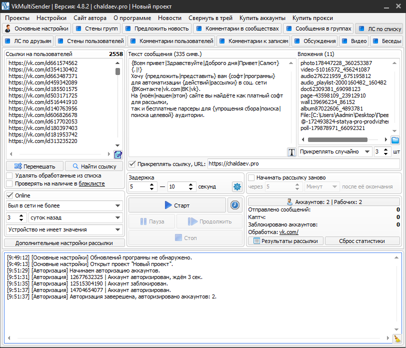 Admin Hunter способен рассылать с нескольких аккаунтов ВК одновременно в многопоточном режиме.