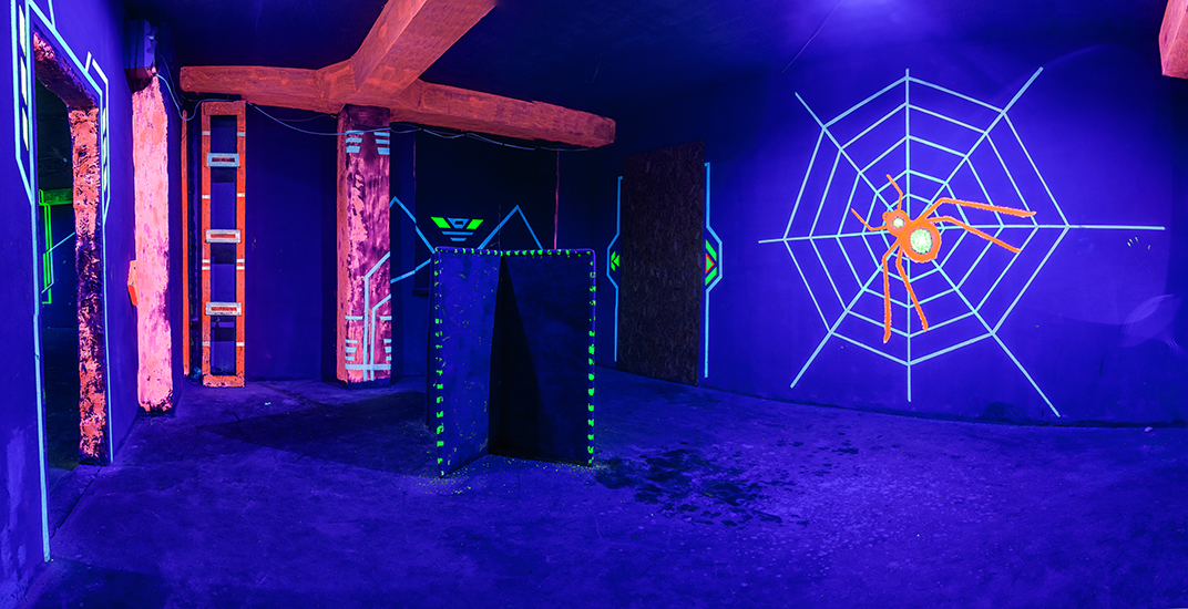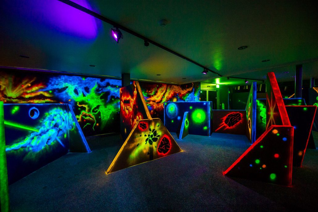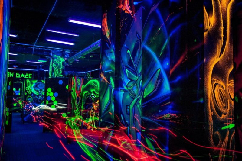 Открытая яркая и сияющая крытая лазертаг-арена в г.