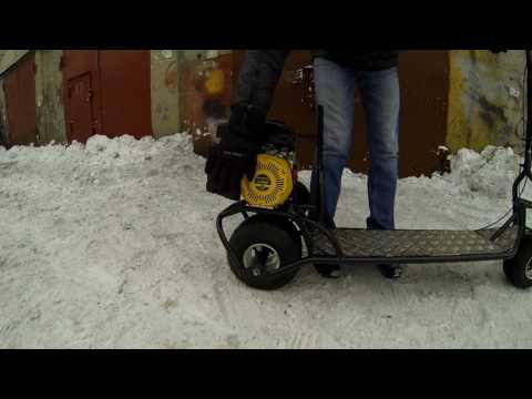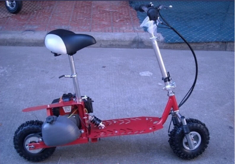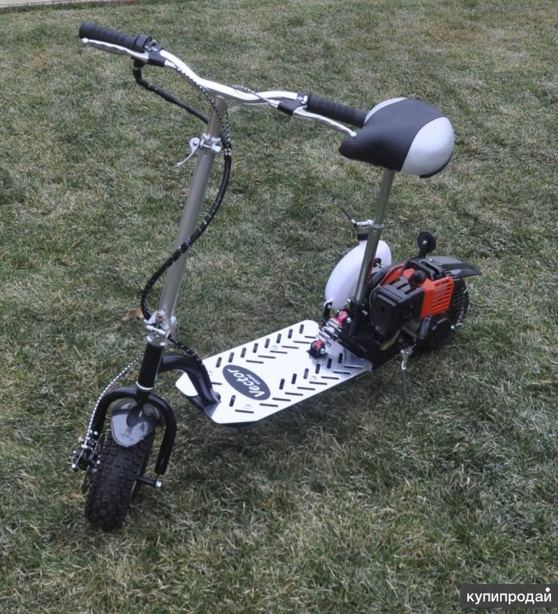 - Газовый скутер оснащен двухтактным двигателем объемом 49 куб. см, имеет органы управления на руле и бак объемом 1,25 литра.