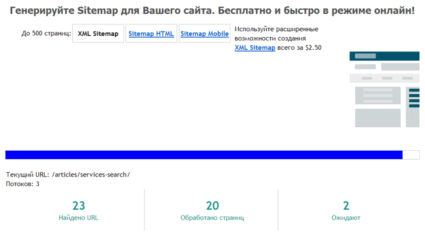 - для больших сайтов (от 5000 страниц) генерация может занять продолжительное время