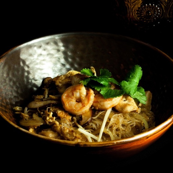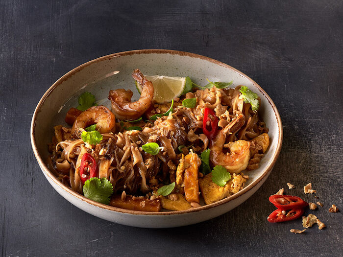 Классика тайской кухни. В аппетитной композиции рисовая лапша, креветки, соус Пад Тай и жареный дроблёный арахис.