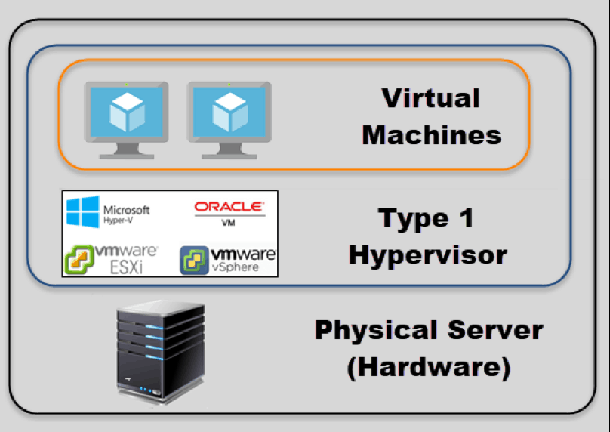 - Гипервизор типа 1: гипервизоры работают непосредственно на аппаратном обеспечении системы — встроенный гипервизор «с нуля».