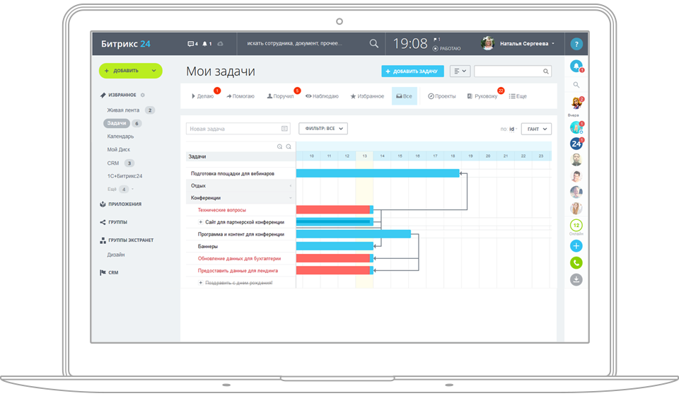 Битрикс24 помогает планировать и выполнять проекты каждый раз вовремя. Доступно онлайн и локально с доступом к открытому исходному коду. Совместное управление задачами для больших и малых команд. Отслеживание времени, напоминания, отчеты, шаблоны, зависимости задач и многое другое. Самая популярная в мире бесплатная CRM по количеству пользователей (6 миллионов компаний и растет). Выдающиеся инструменты помощи в режиме реального времени, которые делают клиентов счастливыми и возвращают их за вашими товарами или услугами. Потрясающе красивые веб-сайты, целевые страницы и интернет-магазины, которые может создать каждый, не написав ни строчки кода. Бесплатное доменное имя и хостинг включены.