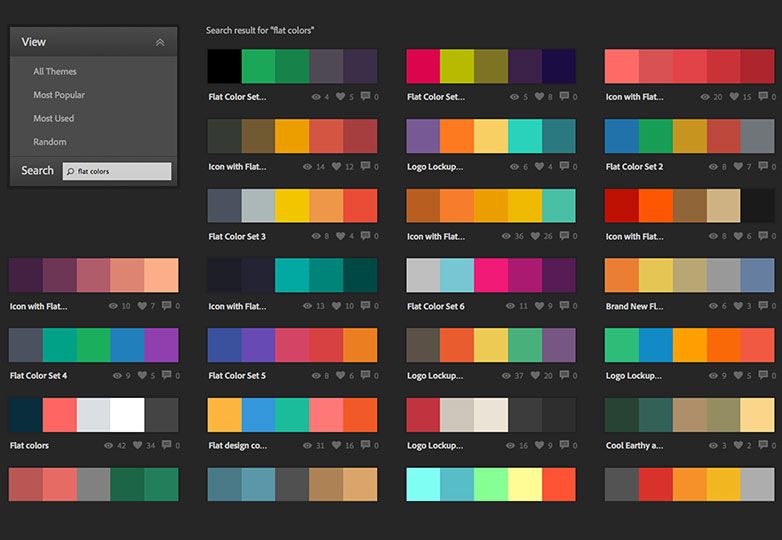 - Adobe Colour CC. Этот инструмент доступен в браузерной и настольной версиях и позволяет пробовать, создавать и сохранять различные цветовые композиции в наборе из 5-ти цветов каждая. При использовании настольного варианта цветовую схему можно экспортировать прямо в Photoshop, InDesign или Illustrator.