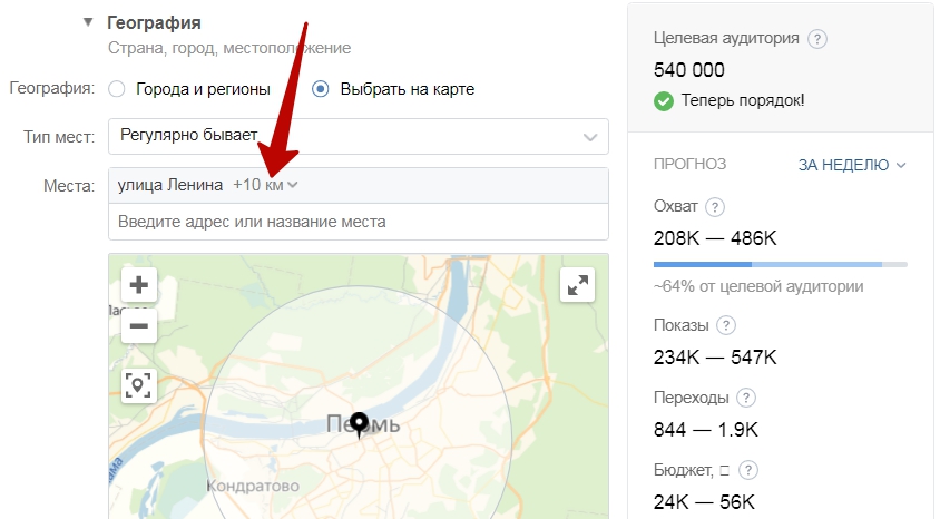 - Facebook позволяет сочетать таргетинг по радиусу только с полом и возрастом.