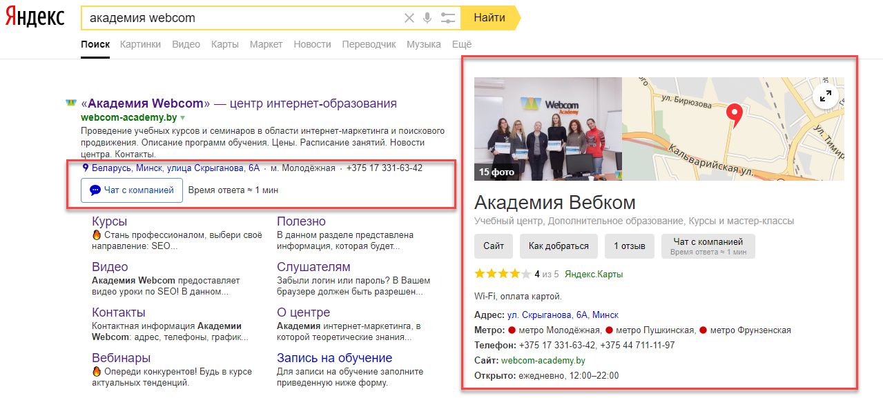 - Адрес, телефоны и другие контакты. По телефонам могут перезвонить модераторы Яндекса, поэтому указывайте только рабочие номера, предупредите секретаря.