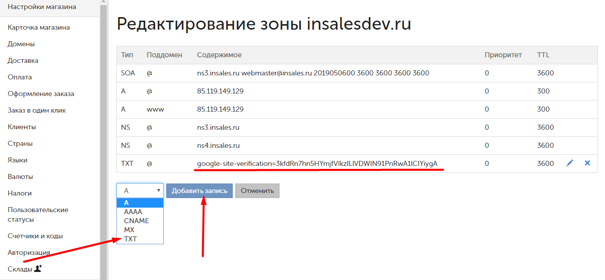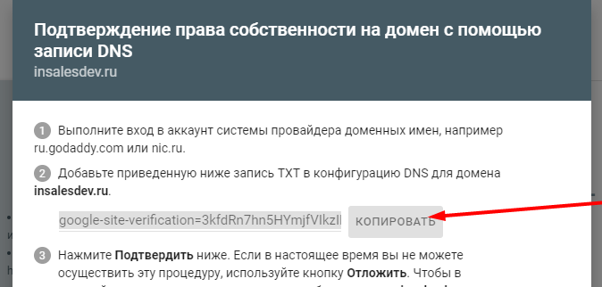 В результате Вы подтвердили права собственности на домен с помощью TXT записи или записи DNS.