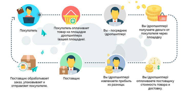 Например, так: конечный покупатель оплачивает стоимость товара дропшипперу, тот удерживает свой процент и переводит остальные деньги поставщику. Есть другой вариант: когда поставщик сам принимает оплату от конечного потребителя, а затем переводит процент за заказ дропшипперу.