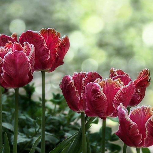 Бокал – 5-7 см в высоту, в диаметре при полном раскрытии около 12-14 см, звездчатой формы. У основания лепестки желто-зеленого оттенка, а основной окрас – малиновый, очень насыщенный. Тюльпан Хумилуск Одалиск очень ранний, цветет на первых неделях апреля.