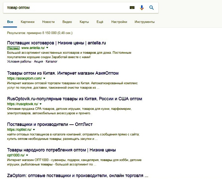 - Поисковая выдача. Обращаясь к поисковым системам, к названию товара добавляйте слово “оптом”. Не останавливайтесь на первой странице — исследуйте все до 20, потому что некоторые, в том числе и хорошие, производители и поставщики не уделяют должное внимание продвижению сайта и потому не попадают в ТОП выдачи.