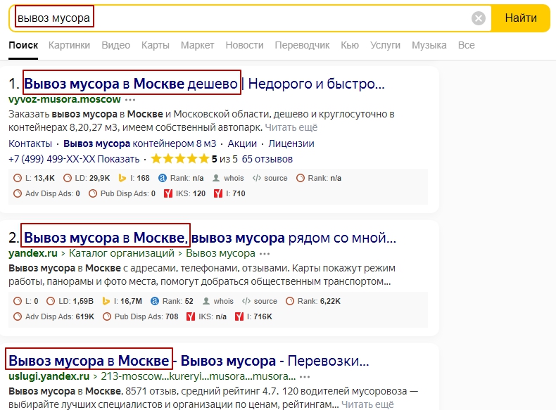 Как мы писали ранее, выдача по геозависимым запросам практически полностью состоит из коммерческих сайтов. Из этого можно сделать вывод, что для продвижения геозависимых запросов необходимо создавать страницу с коммерческой информацией, на которой можно что-то купить или заказать, представлены цены.
