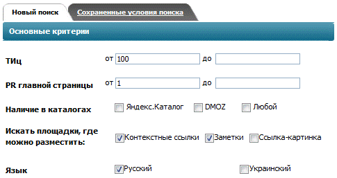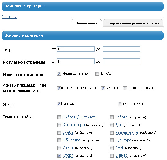 Для сайтов можно выбрать тематику, язык, а также участие в биржах ссылок (таких как Sape, с размещением блочных ссылок в футерах и сайдбарах).