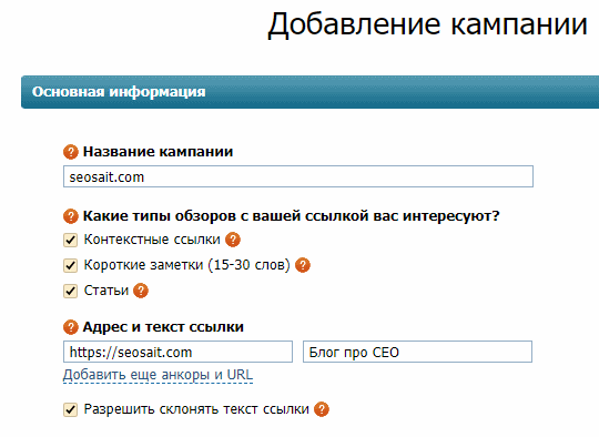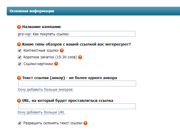 В открывшемся окне указываем название кампании и вид ссылок, которые необходимо покупать.