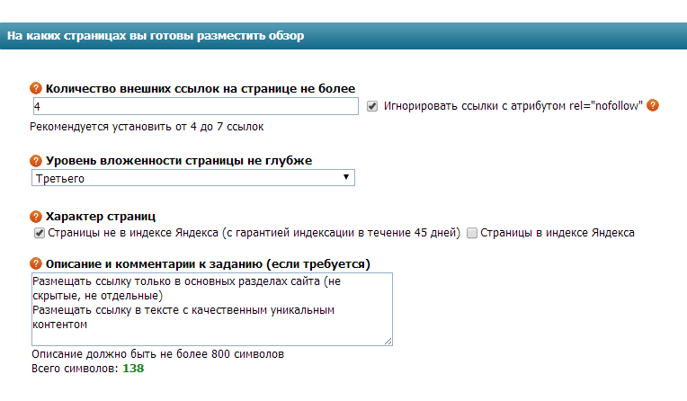 Для страниц можно указать максимальное количество внешних и внутренних ссылок, уровень вложенности и проиндексированость в Яндексе (можно размещать ссылки на уже проиндексированных страницах, а можно на новых, которые создаются специально для нашей ссылки).