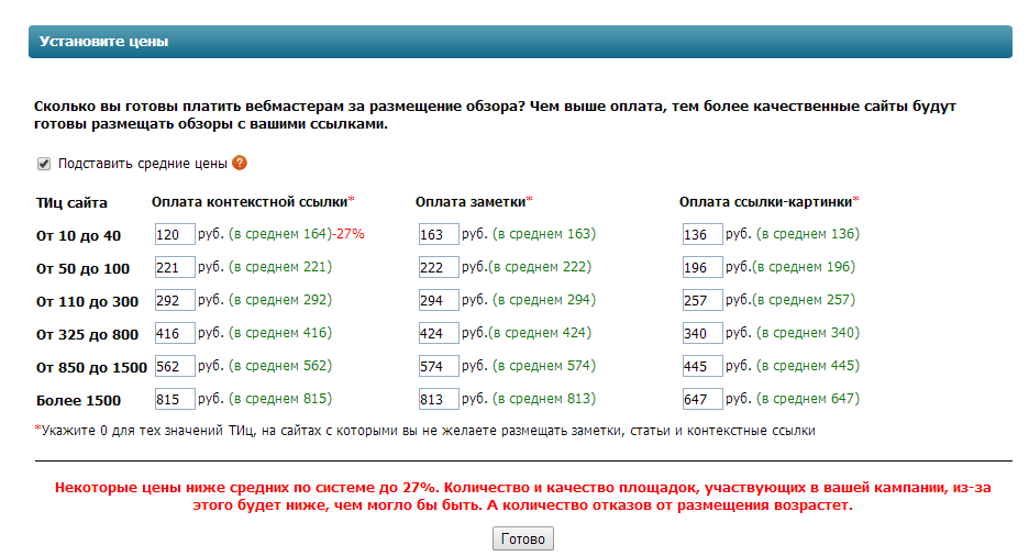 3. Статья не должна быть в скрытых разделах сайта. - Установите цены — тоже не важный параметр. необходим в случае, если вы оставите кампанию открытой для поиска по системе. Нажимайте «поставить средние цены» и все.