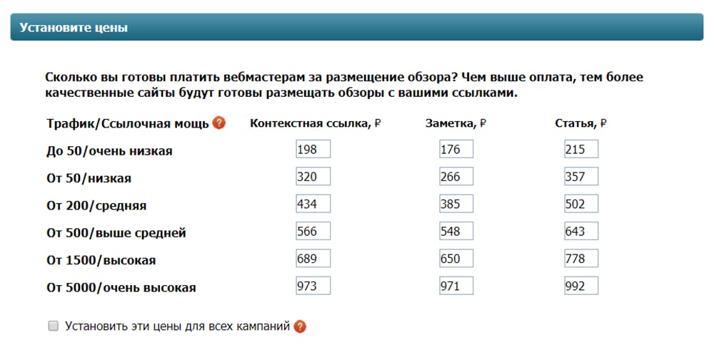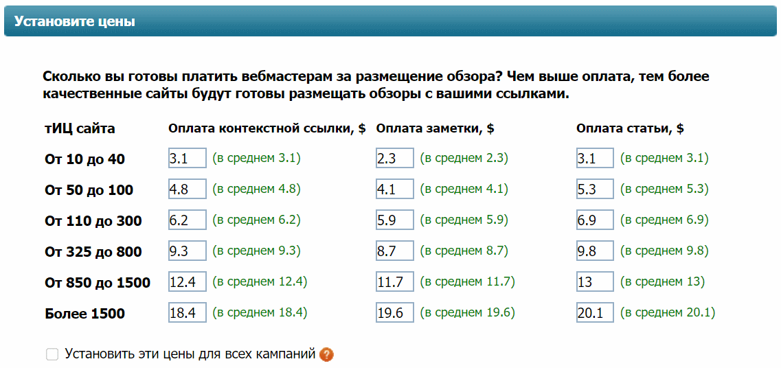 В следующем блоке указываем, сколько мы готовы платить за ссылки на сайтах с определенным значением ТИЦ.