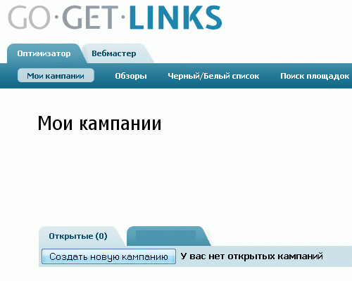 Деньги положены на счет, теперь можно приступать к созданию кампании (кампания – это проект на покупку ссылок). Для этого переходим на вкладку «Оптимизатор» — «Мои компании» и жмем «Создать новую компанию».