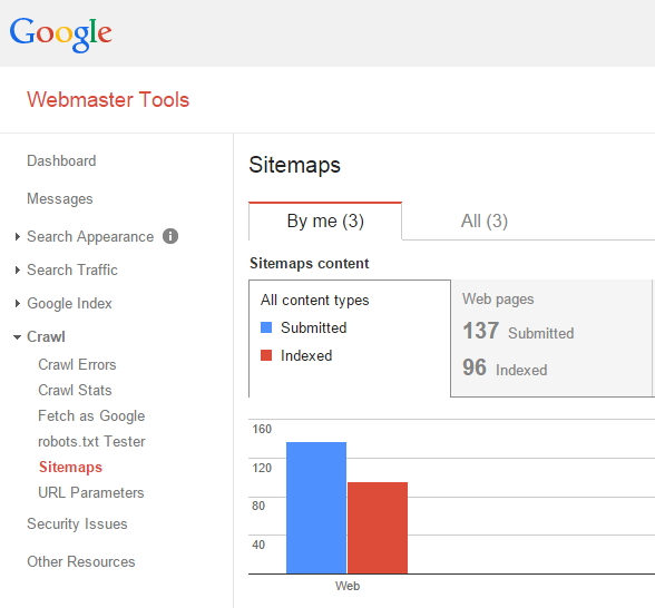 Здесь вы можете получить доступ ко всей информации о любых картах сайта, отправленных вручную или найденных с помощью Search Console. Синяя полоса – это отправленные страницы или изображения, а красная – фактически проиндексированные страницы и изображения.