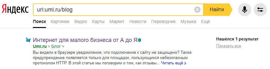 Проверяет индексацию конкретного раздела сайта в Яндексе. Введите команду и после нее адрес домена и путь до раздела. Например, «url:umi.ru/blog» без кавычек.