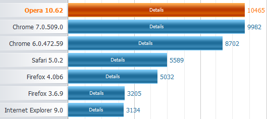 PeaceKeeper, Acid3 и DOM — первый является кроссплатформенным приложением для тестирования производительности, второй — проверяет соблюдение браузерами web-стандартов, третье — производительность DOM-компонентов