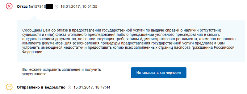 Первый раз пришел отказ, т. к. отправили копию паспорта без страницы с пропиской.