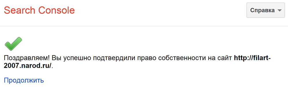 В случае успешной проверки, Вы увидите сообщение с поздравлением о подтверждении права собственности на указанный веб-ресурс.