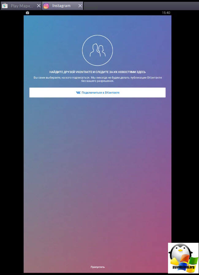 Запустить его можно прямо из Google Play или с главного экрана эмулятора. Непосредственно на этом этапе начинается регистрация инстаграм через компьютер.