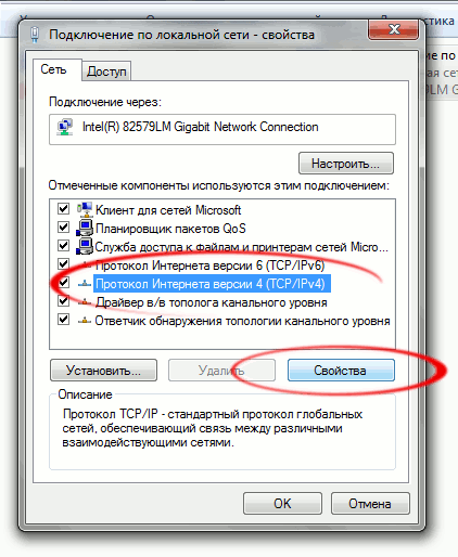 5. В списке компонентов найти пункт «Протокол Интернета версии 4 (TCP/IPv4)», кликнуть по нему один раз, а потом нажать на кнопку «Свойства», или кликнуть двойным кликом: