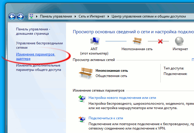 3. В открывшейся странице перейти по ссылке «Изменение параметров адаптера»: