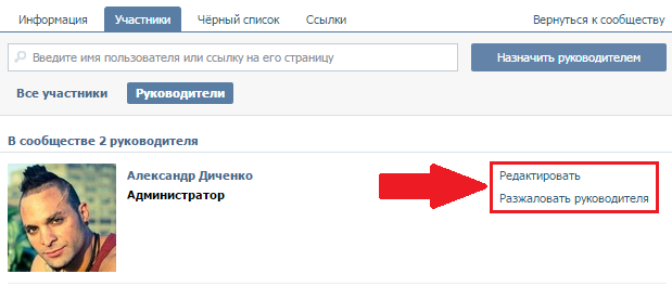 Здесь вы увидите список участников. Нажмите на кнопку «Руководители». В строку введите имя пользователя, а лучше — ссылку на его страницу, после чего нажмите «Назначить руководителем».