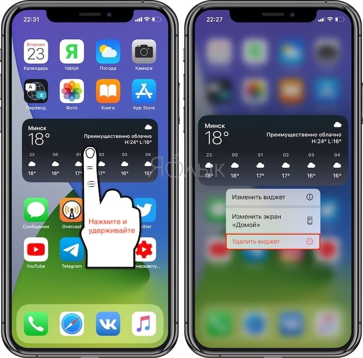 Чтобы удалить виджет, коснитесь знака – в верхнем левом углу виджета в режиме редактирования главного экрана или нажмите и удерживайте виджет, чтобы открыть его быстрые действия, и выберите «Удалить виджет».