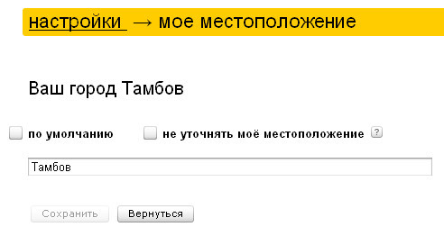 - Нажать на название населенного пункта в левом верхнем углу на главной странице поисковой системы.