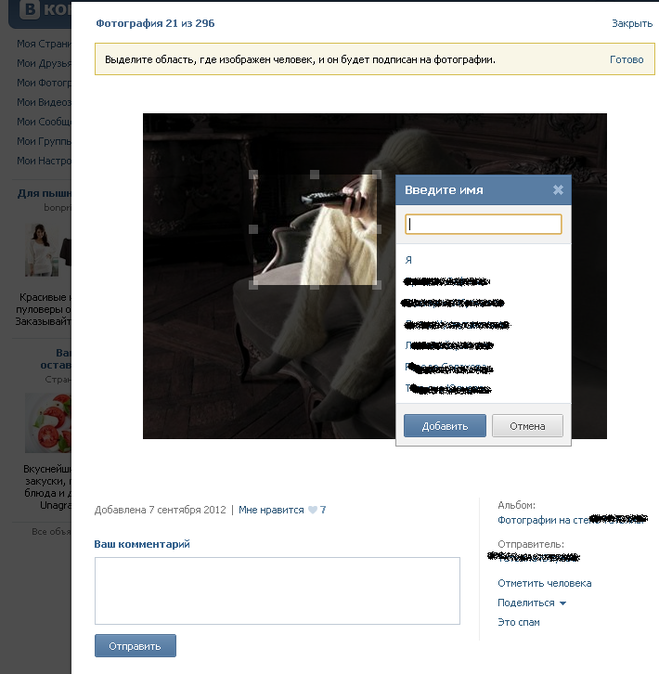 Для этого открываем картинку и справа смотрим список отмеченных пользователей. Чтобы снять отметку, нужно просто нажать на крестик рядом с фамилией.