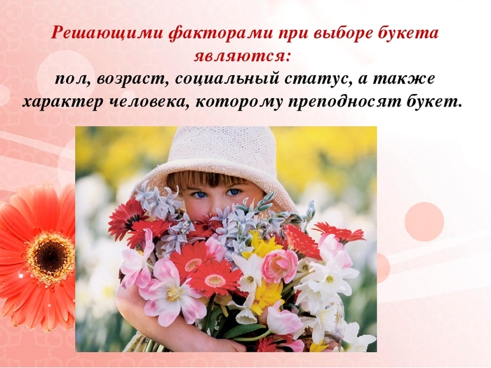 Любой праздник встречают с цветами. Сам по себе букет — подарок произвольный, он дарит только приятные эмоции. Но иногда и его стоит преподносить осознанно, чтобы не оказаться в неловком положении. Ведь многое зависит от повода, возраста и пола получателя, его личных пристрастий, а также от национальных традиций. Поэтому, подарок из цветов — настоящее искусство.