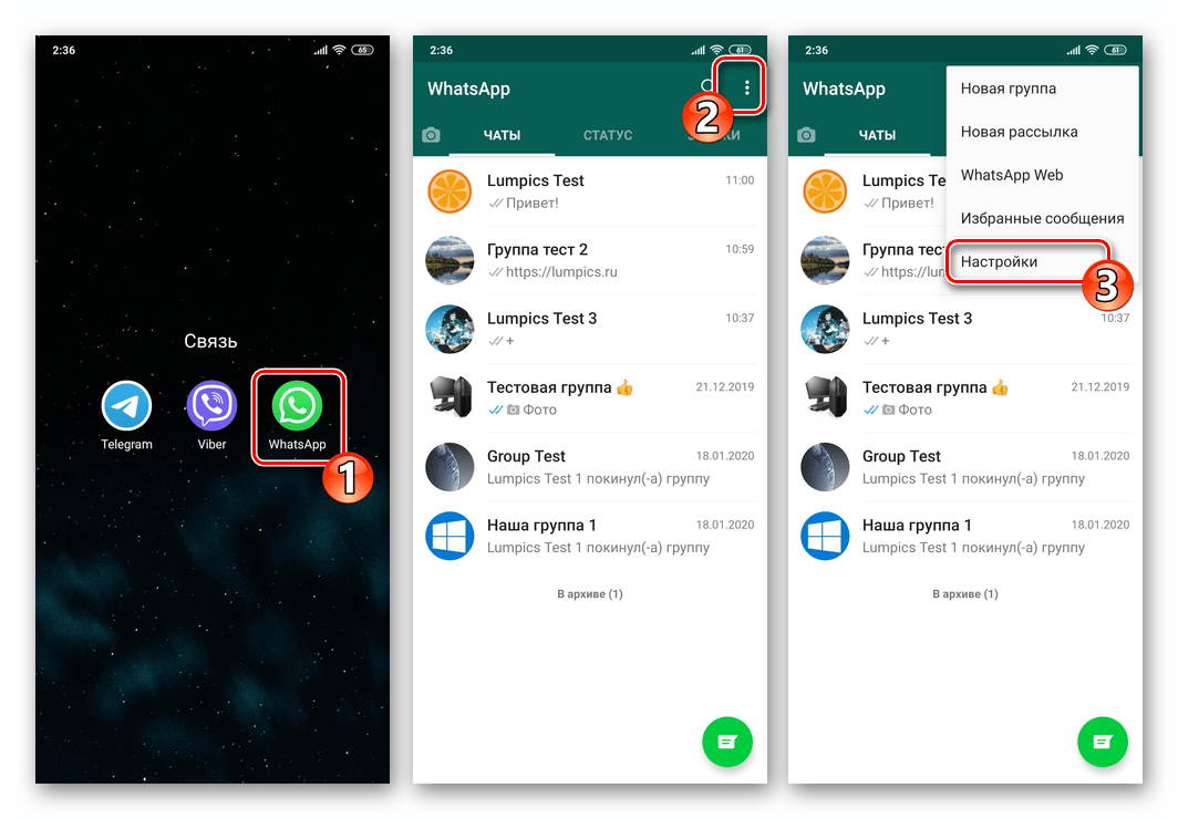 Для начала следует попасть к окну настроек. В приложении iOS на это выделена отдельная вкладка. А на Android необходимо из «Чаты» тапнуть по пиктограмме, где выстроены вертикально в ряд три точки, а затем выбрать последний пункт.