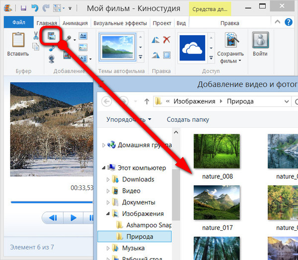 Чтобы создать фотошоу, добавляем в окно программы фотографии на компьютере.