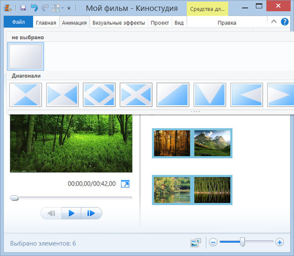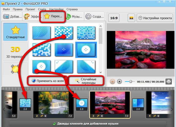 Переключаемся на вкладку «Переходы» и добавляем понравившуюся анимацию переходов между фотографиями. Можно воспользоваться кнопкой «Случайные переходы», чтобы программа сама позаботилась о выборе. Одну выбранную анимацию переходов можно применить ко всем фото кнопкой «Применить ко всем».