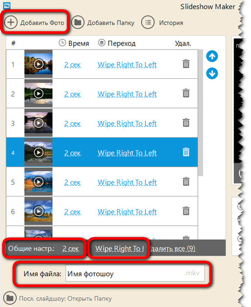 Для создания фотошоу в главном окне программы слева жмём «Добавить фото», выбираем нужные изображения, задаём длительность их показа, выбираем анимацию для перехода, задаём имя видеофайла для сохранения.