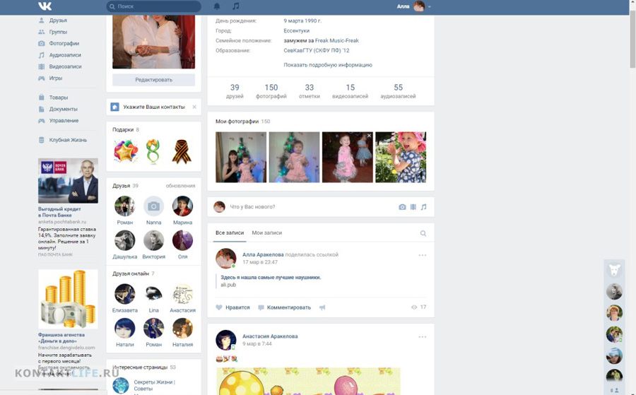 Посмотрим, как выглядит аккаунт ВКонтакте, если доступ разрешен даже незнакомцам. Для этого спускаемся вниз и нажимаем на ссылку «посмотреть, как видят Вашу страницу другие пользователи».