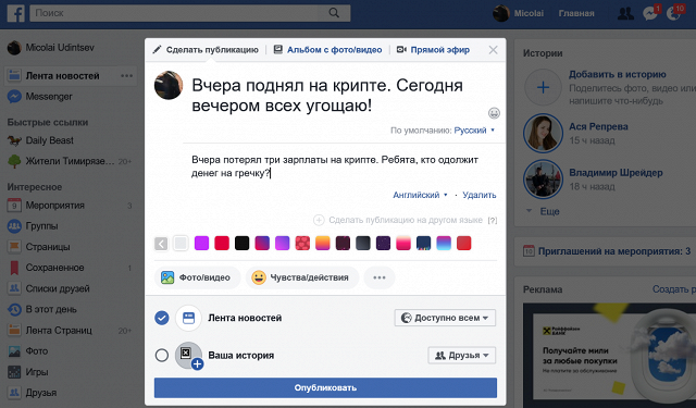 После этого в окне нового поста у вас появится серая надпись «Сделать публикацию на другом языке». Если кликнуть на нее, то появится второе поле для ввода текста. Туда пишут текст для людей, у которых Facebook на другом языке, но он необязательно должен быть на английском — можно написать что-угодно на русском.