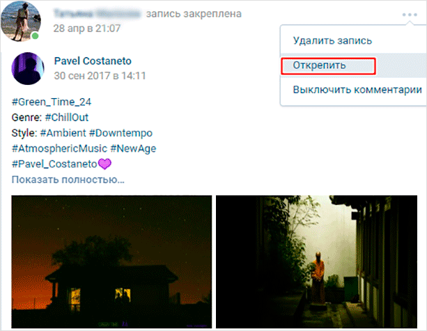 Что касается того, как сделать, чтобы вообще никакой пост не был закреплен, то делается это очень просто – открываем то же самое меню путем нажатия на текст поста или на дату его размещения.