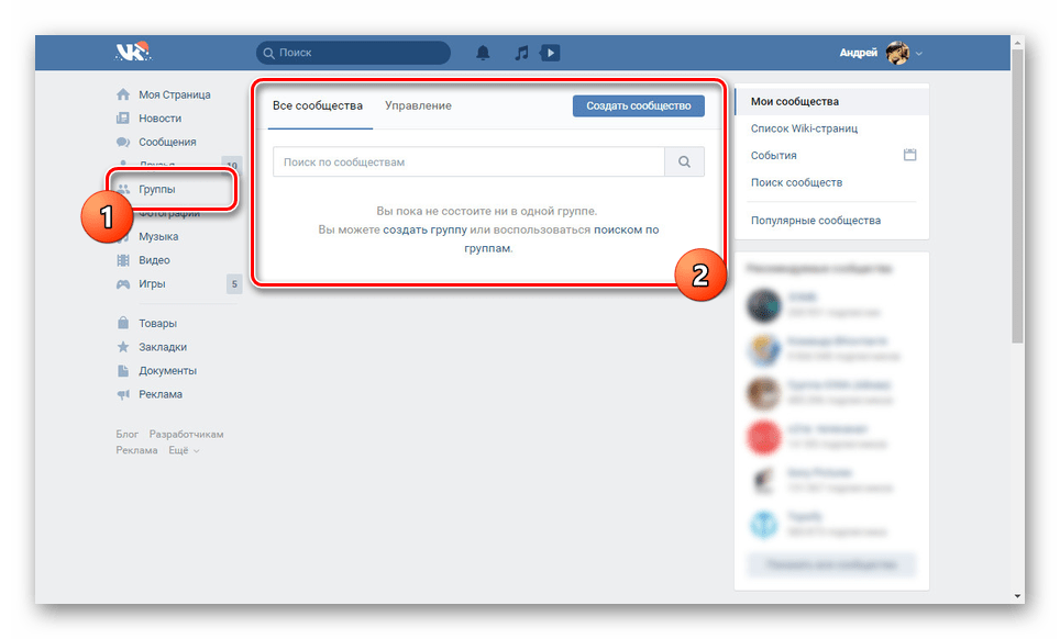 Личные страницы и сообщества вынесены в отдельный блок. При клике по нему Вы увидите два подраздела — со страницами и сообществами соответственно.