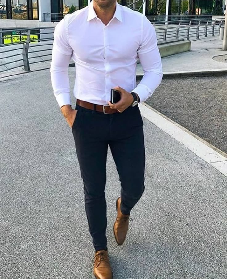 73. Повседневная кожаная обувь делает любой повседневный образ более стильным.