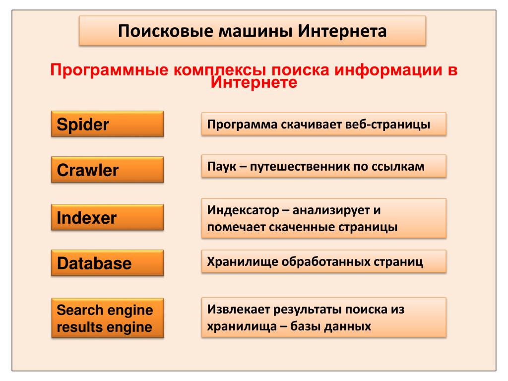 Перед тем, как ответить вам где найти нужный документ или файл, это файл или документ должен быть уже когда то найден. Чтобы найти информацию о сотнях миллионах существующих WEB-страниц, поисковая машина применяет специальную программу-робот. Эта программа еще называется спайдер («spider», паук) и служит для построения списка слов, найденных на странице. Процесс построения такого списка называется
