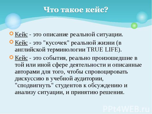 Кейс — описание какой-либо ситуации. В кейсе описана какая-либо ситуация из социальной сферы жизни, экономической, медицинской и т. д. Отличительной чертой кейсов является то, что они максимально приближены к реальности.