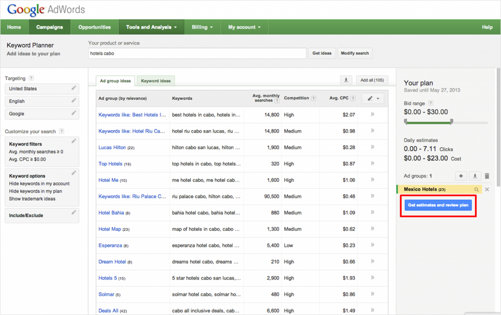 Планировщик ключевых слов предоставит вам рекомендуемые ставки для каждого ключевого слова, чтобы вы могли определить свой рекламный бюджет.