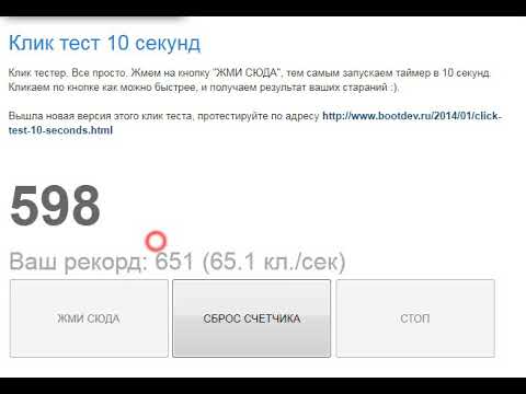 Тест На Скорость Клика — отличный способ познакомиться с быстрым нажатием, увеличить количество кликов в секунду и попрактиковаться в нажатии во время игры. Его также можно использовать для проверки того, сколько кликов вы делаете в секунду или минуту, что полезно, если вы хотите улучшить скорость кликов для целей строительства или других целей.