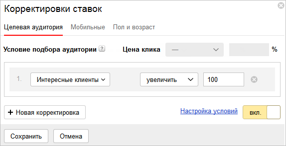 Корректировка ставок в контекстной рекламе — это процент отклонения ставки за клик по объявлению в большую или меньшую сторону в зависимости от заданных рекламодателей параметров.