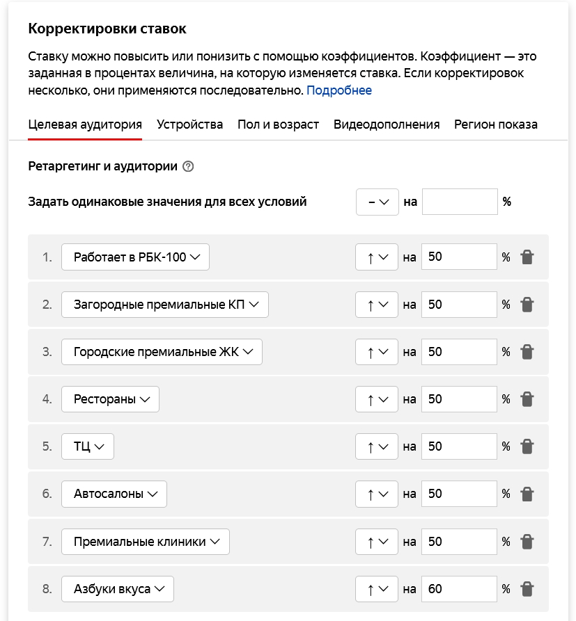 2. Корректировки по условиям ретаргетинга и подбора аудитории