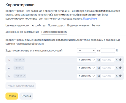 Если сайт адаптивен, рекомендуем задать повышающую корректировку, например, +10 или +20%. В мобильной выдаче Яндекса количество мест в спецразмещении меньше, чем на декстопах. Соответственно, конкуренция за спецразмещение на мобильных устройствах выше.